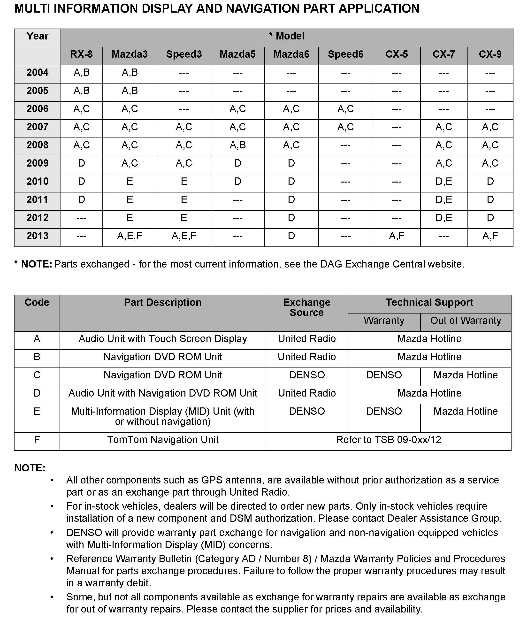 The multi Information display (MID) and navigation system support for diagnostics, parts authorization, and parts exchange require contacting the proper source. Please contact the appropriate source by referring to the tables.