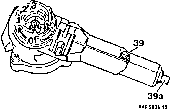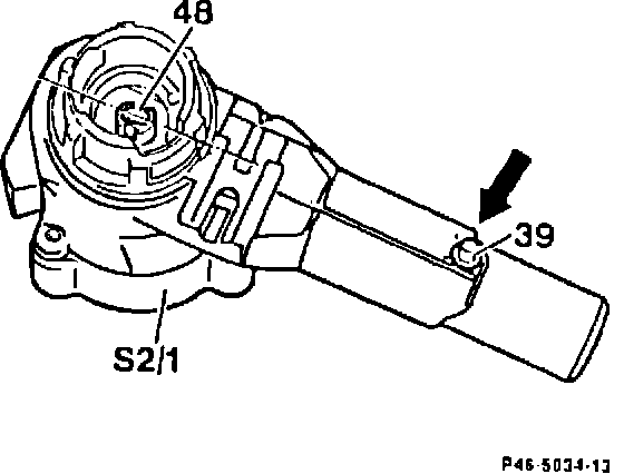 1. The steering lock can only be installed with the lock cylinder in position "1" (Figure 2). In position "1", the rectangular recess in the driver (48, Figure 1) is parallel with the steering lock axis, allowing the lock pin (39, arrow) to be pushed in. The electrical ignition/starter switch (S2/1, Figure 1) must be mounted on the steering lock for installation.