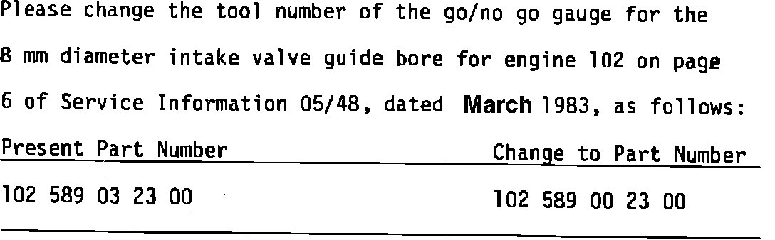 When use of the repair version (color code: red) is necessary, the bores in the cylinder head must be machined with a broach (diameter: 14.2 or 15.2 mm). For this procedure a guide sleeve is required, because the bore for the valve guide and the valve seat insert must be accurately aligned. The guide sleeve and broach combinations for the various engines are shown in Table 2 of the attached Work Instructions.