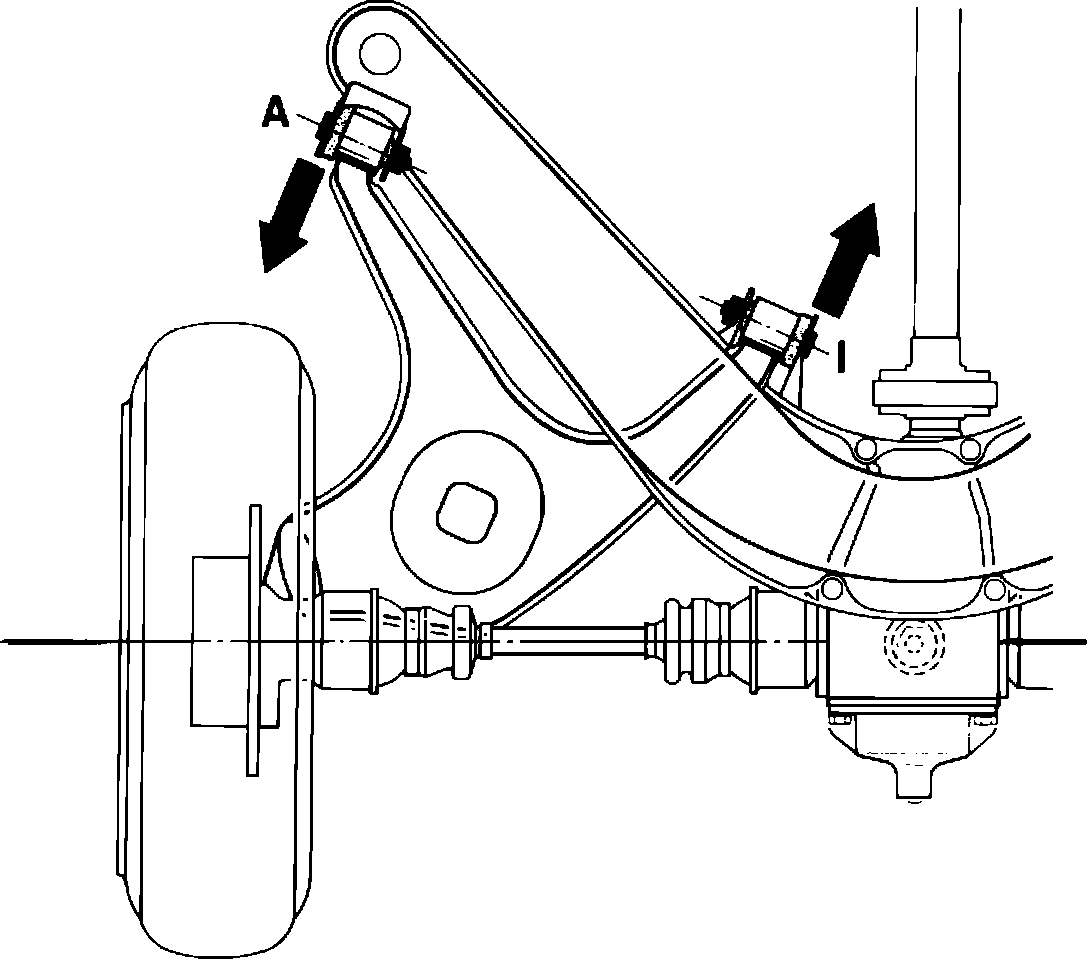 Toe-in can be corrected or the nominal value can be attempted by the installation of eccentric rubber mounts in the semi-trailing arms. Semi-trailing arm eccentric rubber mount part No. 1233520765 is available to correct toe-in. To reduce toe-in, install outer rubber mount, (A) with arrow pointing toward the rear as shown in Fig. 1 and inner rubber mount (1), pointing toward the front.