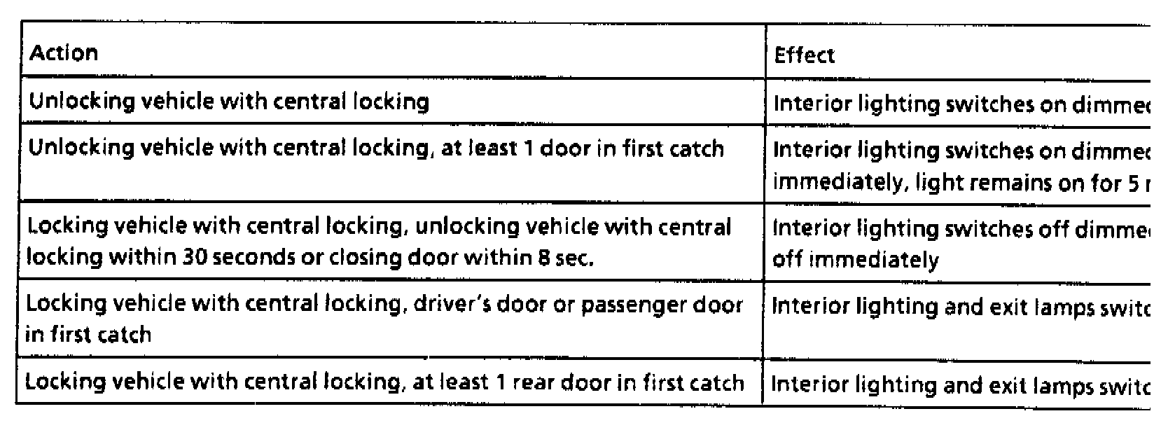 The table indicates how the lamps in the vehicle interior react when the central locking is actuated. Door in first catch position means that the door contact is not yet actuated.
