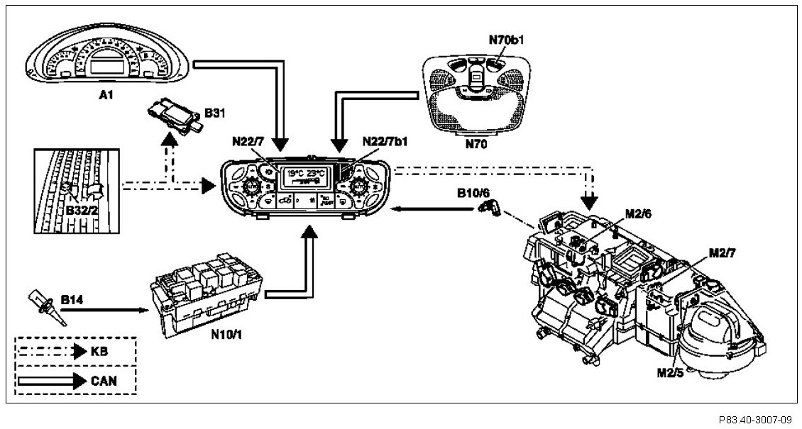 In addition the outside temperature is also determined by the outside temperature indicator temperature sensor (B14), the humidity is determined by the C-AAC multifunction sensor (B31) and the intensity and direction of the solar radiation is determined by the C-AAC sun sensor (4 sensors in total) (B32/2). The electronic control of the comfort AAC pushbutton control unit (N22/7) compares the various measured values with the temperature preselected at the temperature pushbuttons.