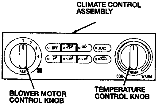 The climate control assembly switch knobs are the blower motor control knob and the temperature control knob.REMOVAL