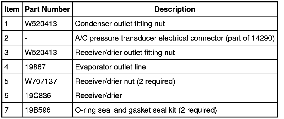 NOTE: Installation of a new receiver/drier is not required when repairing the A/C system, except when there is physical evidence of contamination from a failed A/C compressor or damage to the receiver/drier. Damage to the receiver/drier includes leaks, physical damage to the receiver/drier shell or desiccant, or moisture contamination. Moisture contamination results only from a complete loss of refrigerant, and equalization of the refrigerant system pressure with atmospheric pressure for a period longer than one hour. If even a slight amount of positive refrigerant pressure is present in the refrigerant system before repairs are carried out, a new receiver/drier should not be installed.