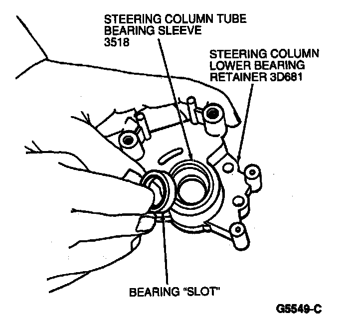 3. Press in the new steering column tube bearing with thumb pressure until seated. Slot between inner and outer races should out from the steering column lower bearing retainer.