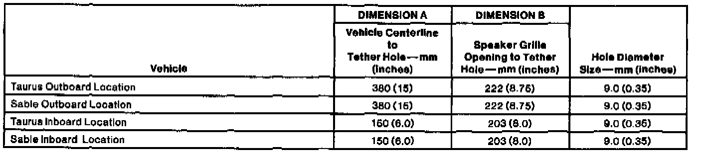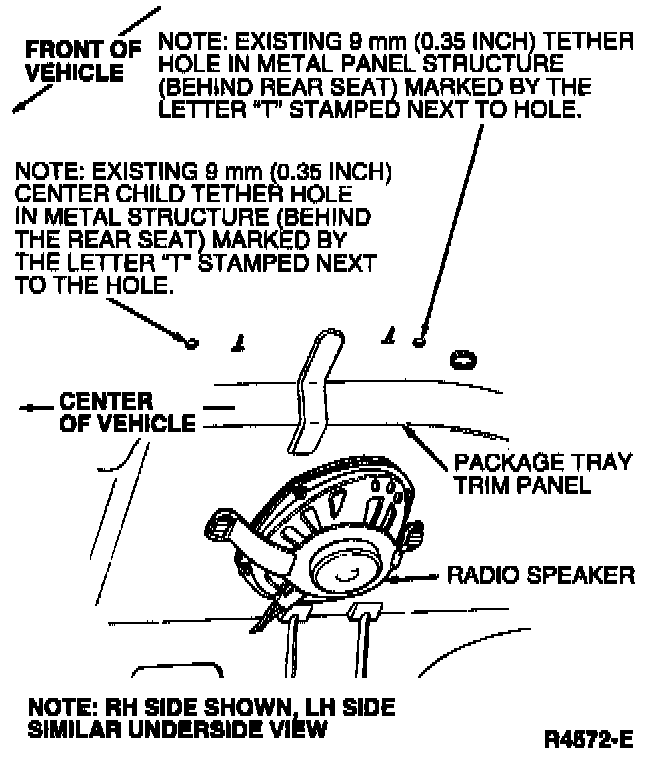On sedan models, there are three (one on each side and one near the center) 9 mm (0.35 inch) diameter top tether attachment holes in the rear package tray trim panel structure (behind the rear seat). These holes allow attachment of the child safety belt anchor tether hardware supplied with the child's safety seat (if required). For easy identification, these holes are marked with the letter "T" stamped behind the hole.