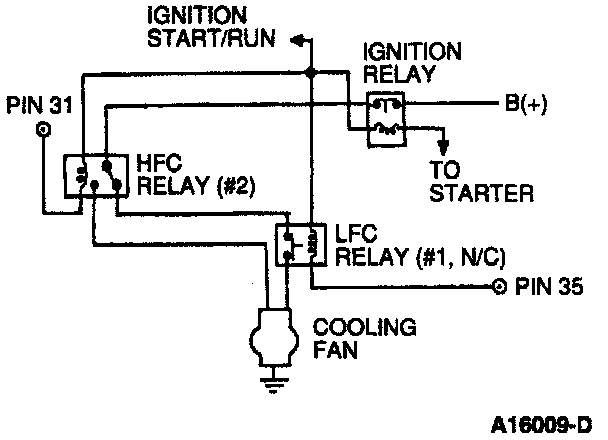 For A/C systems using R12 refrigerant: the circuit from the medium pressure contacts is spliced into the HFC circuit between the PCM and the HFC relay. When the A/C pressure reaches the predetermined level, the medium pressure contacts will close. This grounds the HFC circuit which closes the HFC relay and turns on the high speed fan.