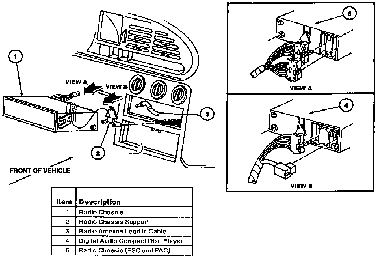 4. Disconnect the connectors and remove the radio chassis and digital audio compact disc player.
