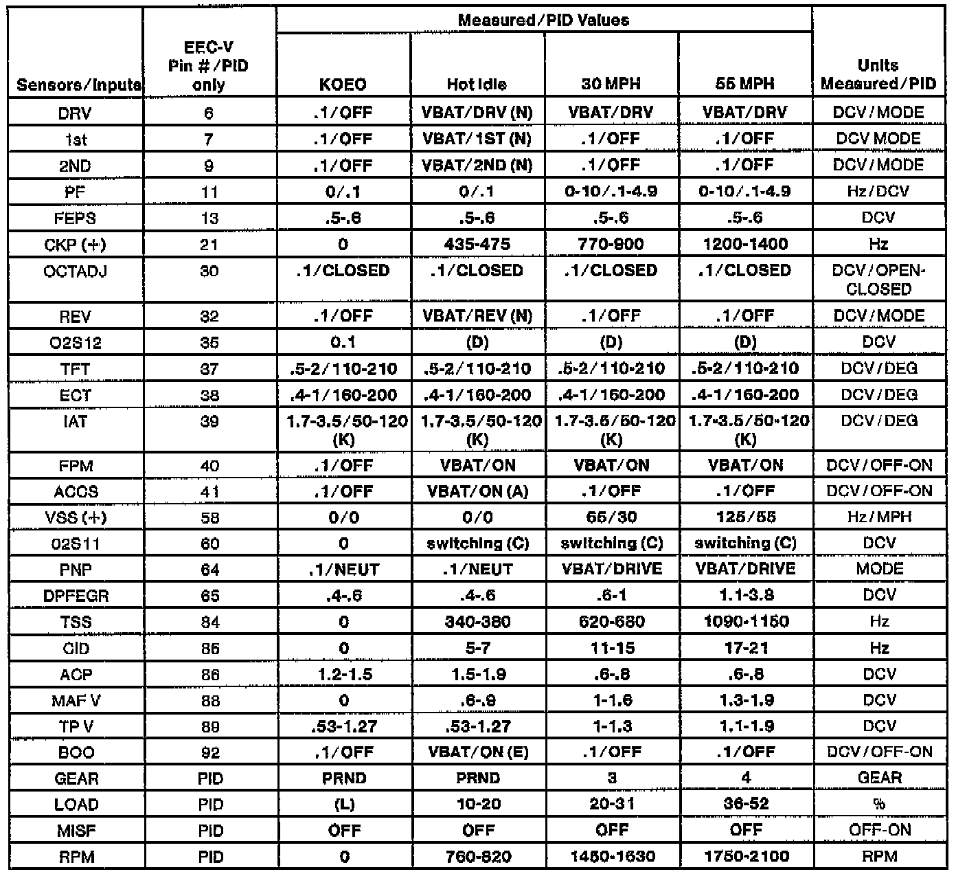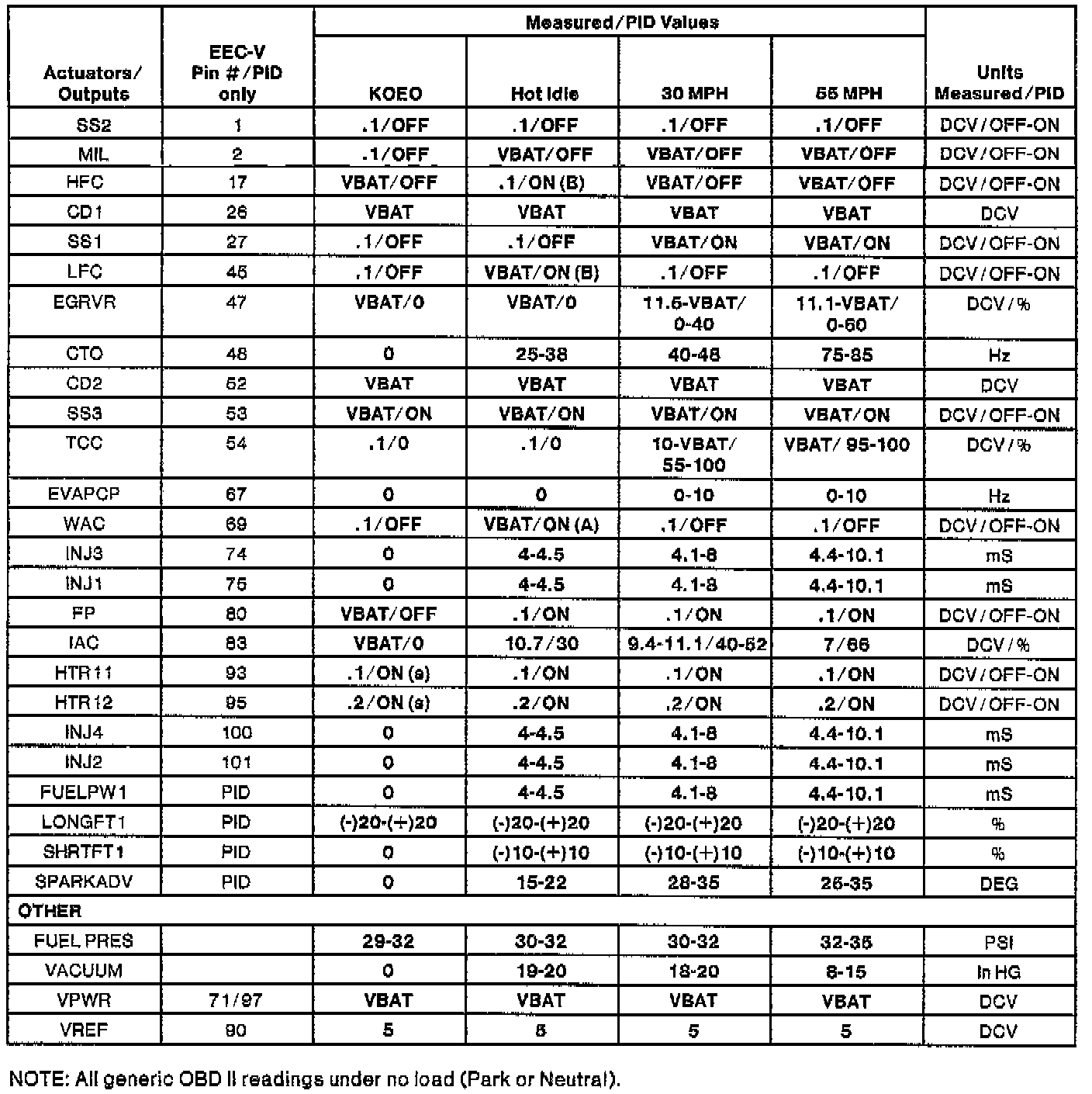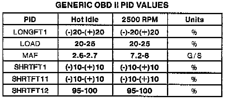 NOTE: All generic OBDII readings under no load (PARK or NEUTRAL).