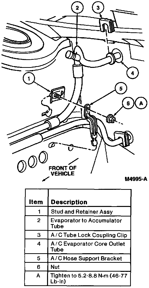 3. Using new O-ring seals lubricated with clean refrigerant oil, connect suction accumulator/drier inlet tube to A/C evaporator core outlet and A/C manifold and tube to suction accumulator/drier.