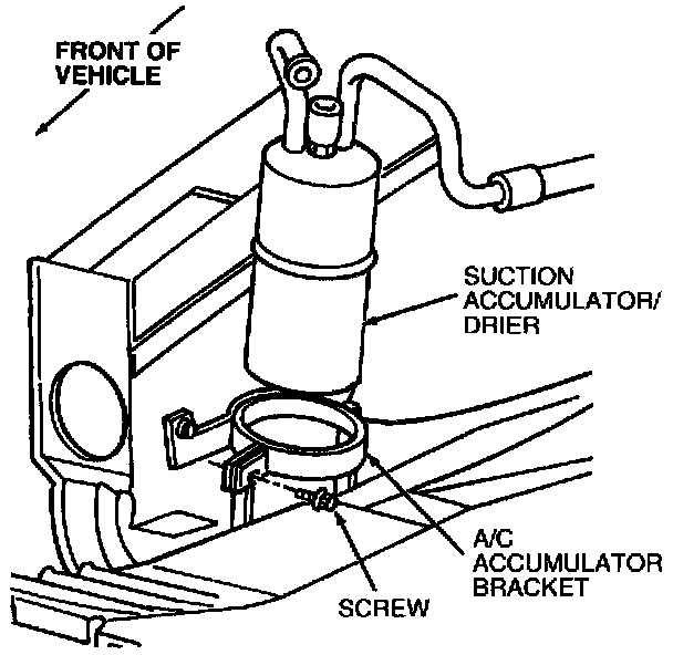 8. Loosen screw holding suction accumulator/drier in A/C accumulator bracket and remove suction accumulator/drier from A/C accumulator bracket.
