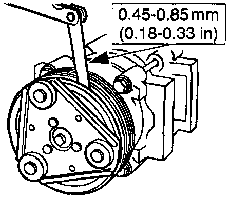 2. Remove the A/C clutch. Add or remove spacers between the A/C clutch and the compressor shaft until clearance is within 0.45-0.85 mm (0.18-0.33 inch).