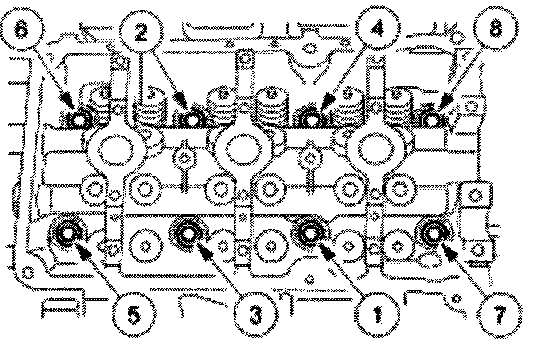 Position the RH cylinder head, gasket and install the bolts in the sequence show in six stages.