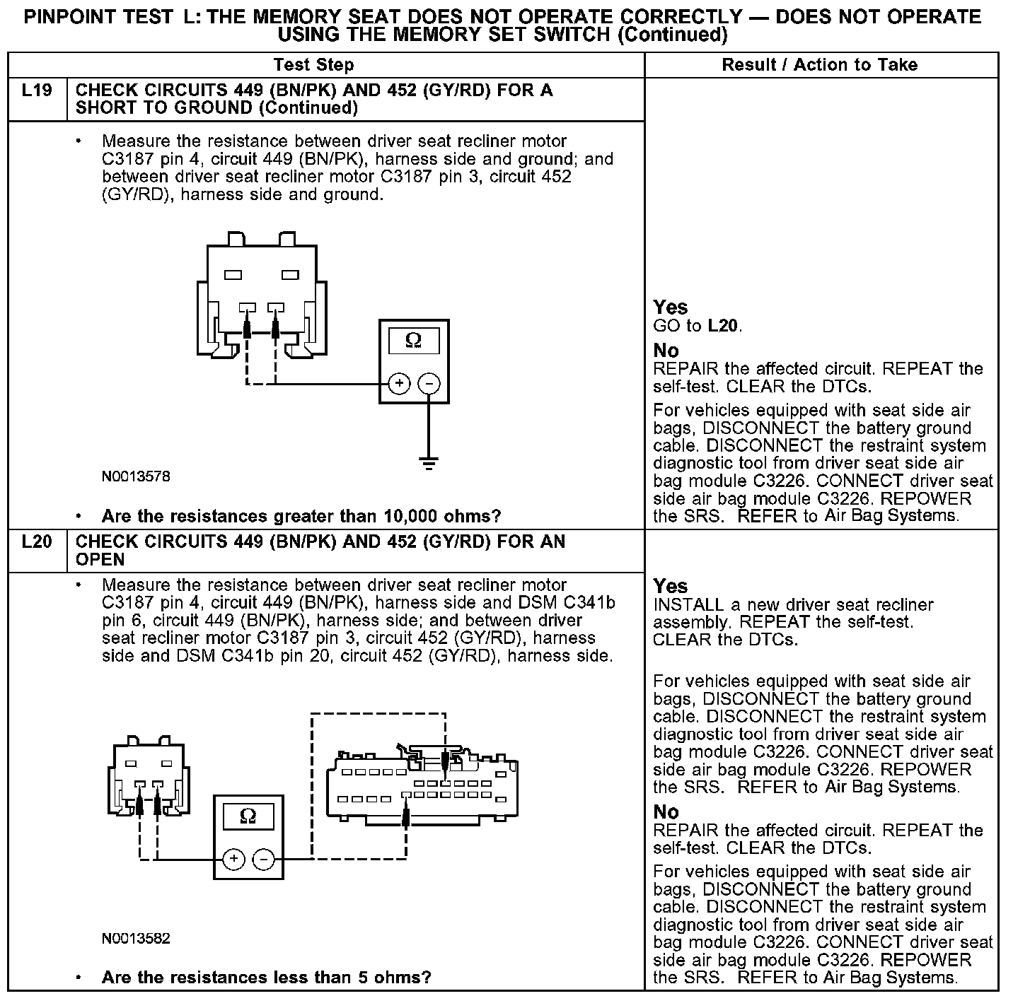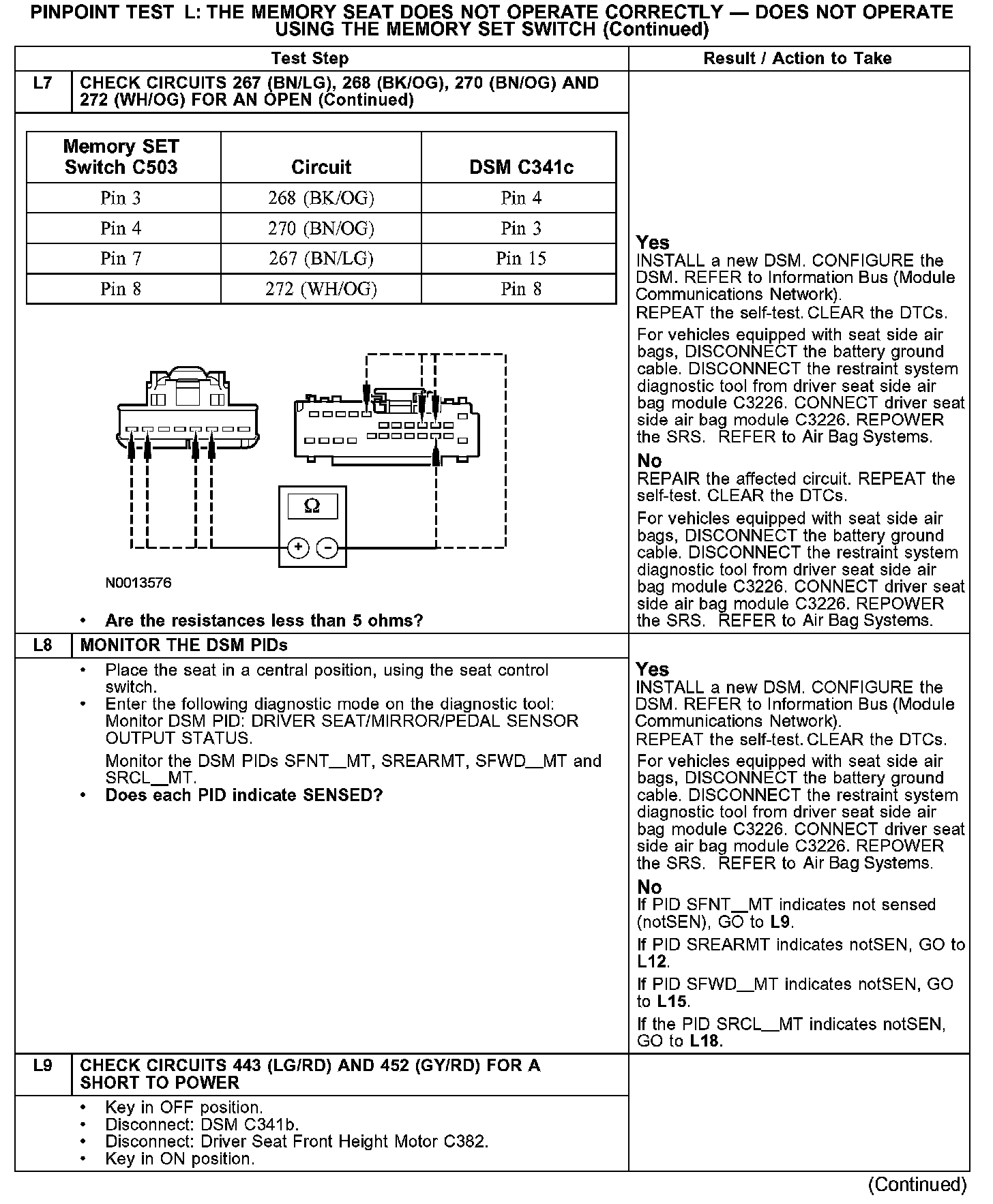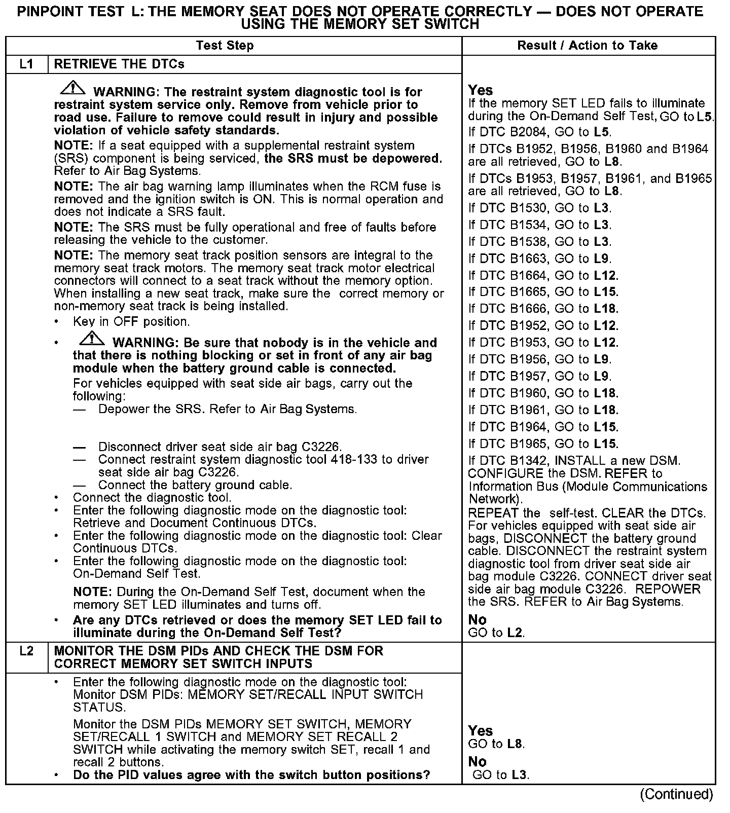 PINPOINT TEST L: THE MEMORY SEAT DOES NOT OPERATE CORRECTLY - DOES NOT OPERATE USING THE MEMORY SET SWITCHL1-L2: