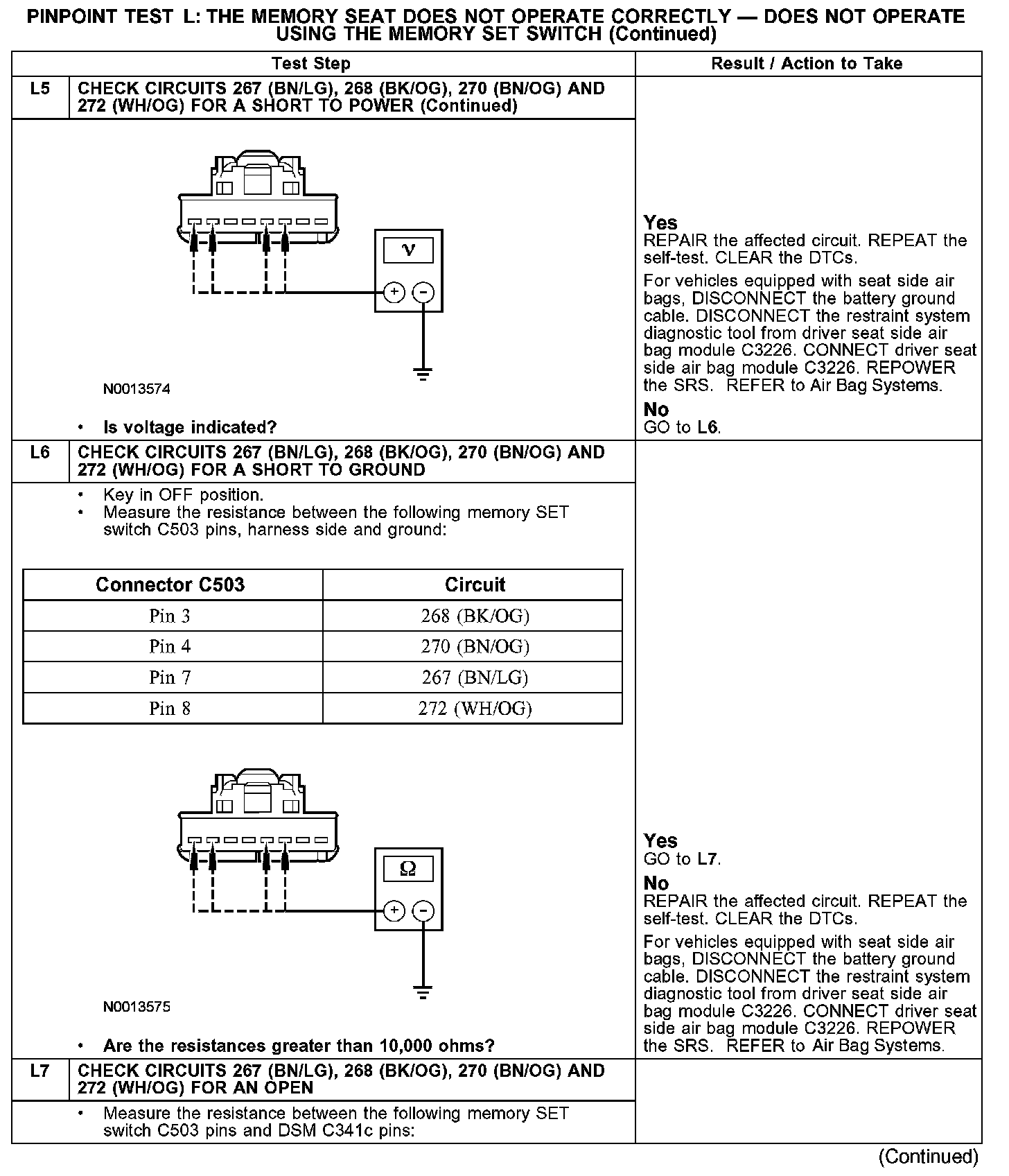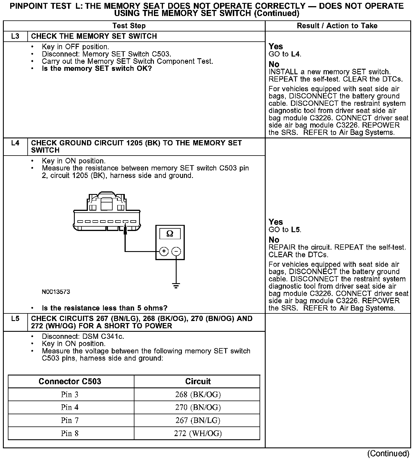 The following pinpoint test diagnoses a memory seat that does not operate correctly using the memory SET switch. If the memory seat does not move in all directions using the seat control switch, GO to Pinpoint Test K. Test K: The Memory Seat Is Inoperative