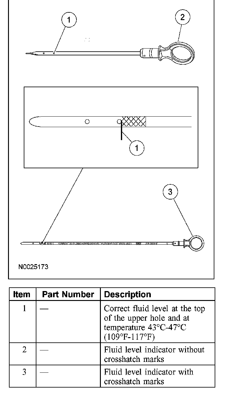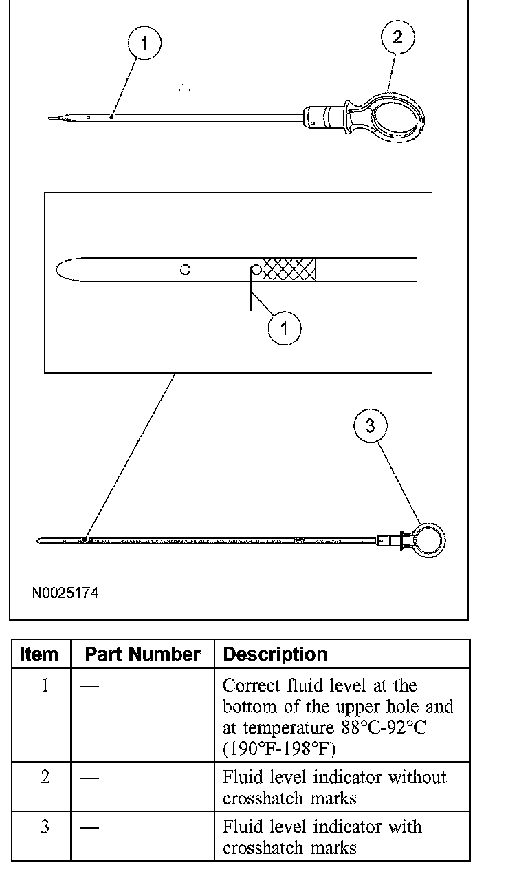 With the transmission fluid in the normal operating temperature range 88°C - 92°C (190°F - 198°F) the minimum acceptable level would be at the bottom of the crosshatch mark on the fluid level indicator. The maximum acceptable level would be no higher than the top of the crosshatch (12 mm (0.47 inch) from the top of the upper level setting hole) area.