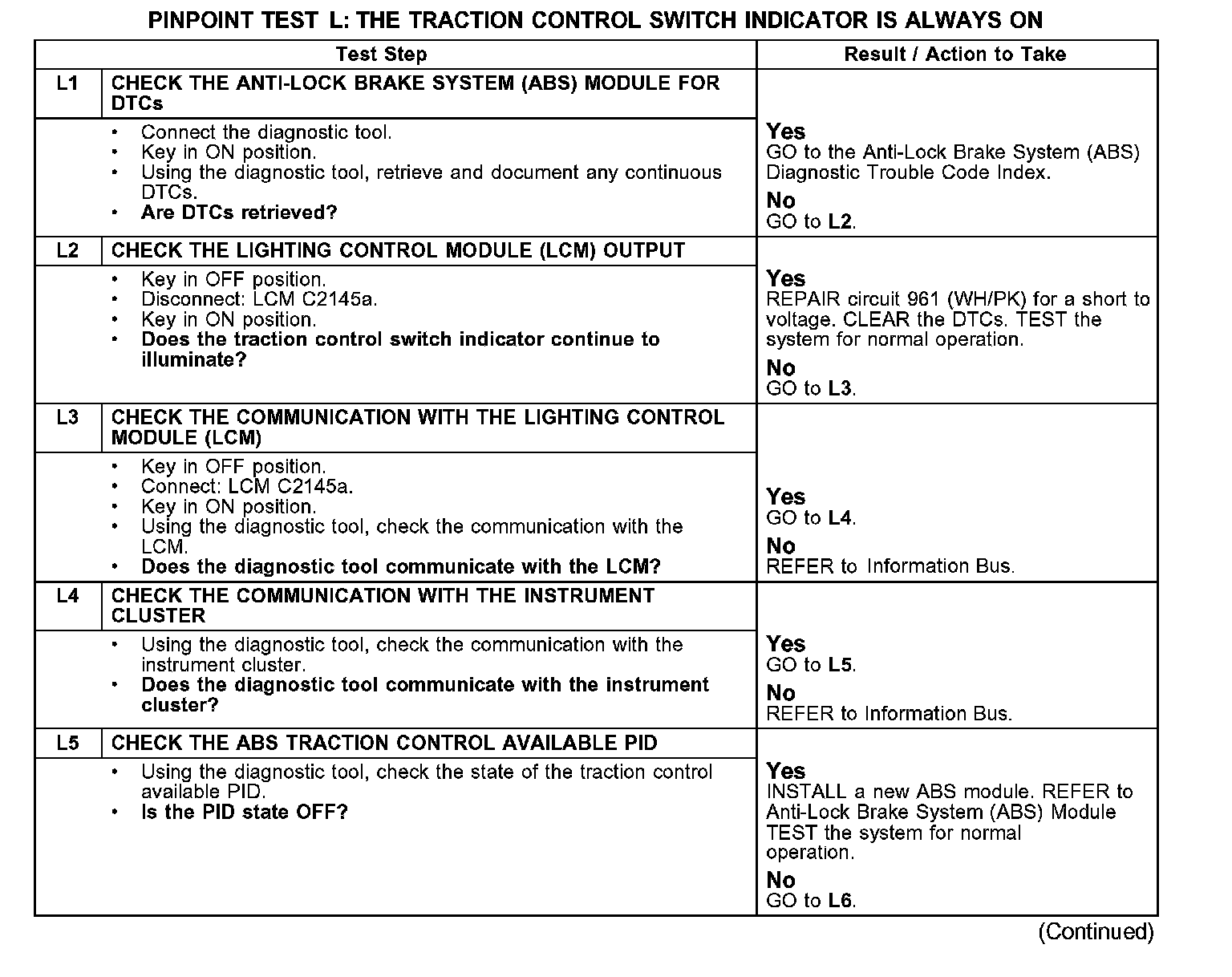 The anti-lock brake system (ABS) module sends a reference voltage to the traction control switch along circuit 959 (GY) to the traction control switch. When the switch is pressed, the reference voltage continues through the switch to ground along circuit 57 (13K). The ABS module then disables the traction control system when it detects this change in reference voltage and sends a message to the instrument cluster along the CAN bus to illuminate the indicator. After receiving the ABS module message, the instrument cluster sends a message to the lighting control module (LCM) to illuminate the indicator and the LCM supplies voltage to circuit 961 (WH/PK) which illuminates the indicator.