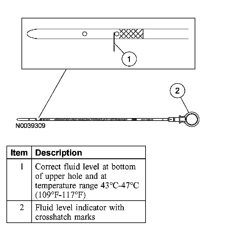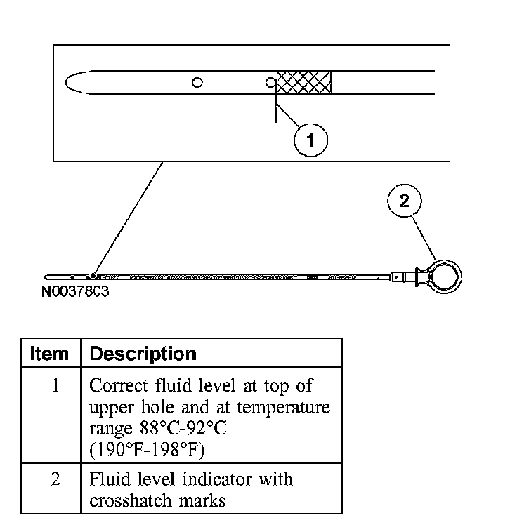 ^ With the transmission fluid in the normal operating temperature range of 88°C - 92°C (190°F - 198°F), the minimum acceptable level would be at the bottom of the crosshatch mark on the fluid level indicator. The maximum acceptable level would be no higher than the top of the crosshatch, 12 mm (0.47 inch) from the top of the upper level setting hole area.