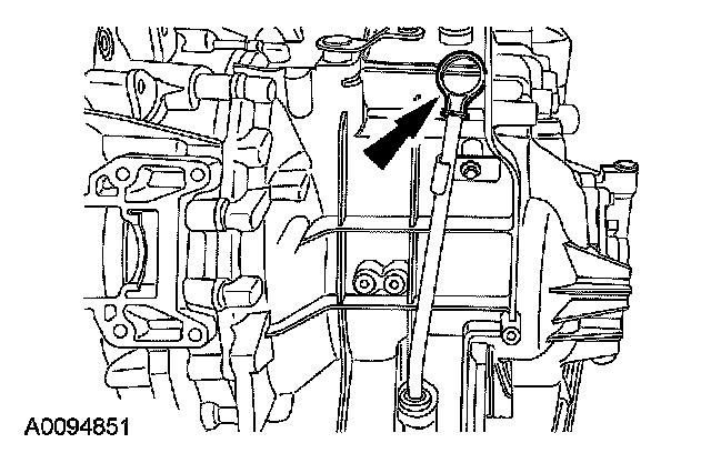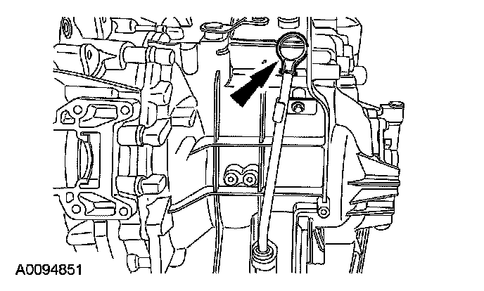 6. Remove the fluid level indicator and check for correct fluid level. The fluid level should be at the bottom of the top level indicator hole with the CVT automatic transmission fluid temperature in the 43°C - 47°C (109°F - 117°F) range.
