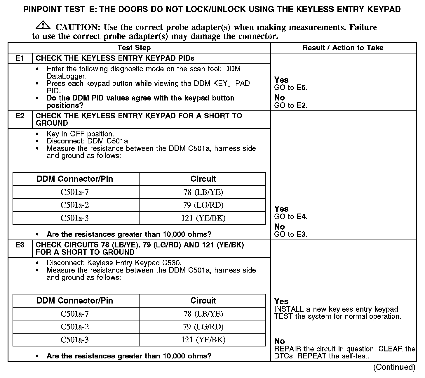 The driver door module (DDM) monitors the keyless entry keypad through circuits 78 (LB/YE), 79 (LG/RD) and 121 (YE/BK). As each button is pressed, a connection to ground through individual resistors occurs. The DDM receives the ground signals from the keyless entry keypad and operates the locks accordingly.