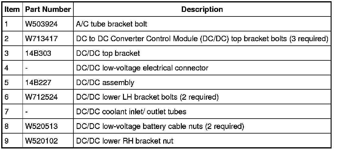 11. NOTICE: Do not remove the DC to DC Converter Control Module (DC/DC) LH lower bracket from the vehicle rail, as this may degrade the vehicle ground attachment and DC/DC alignment.