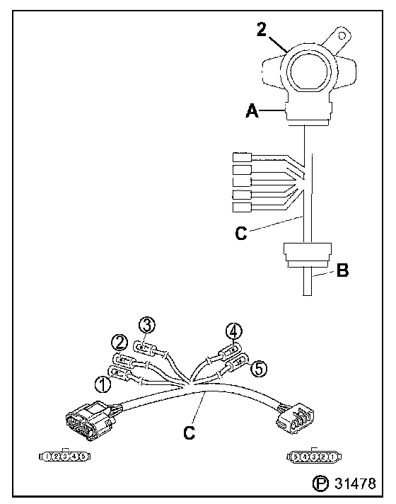 - Disconnect connector A of accelerator pedal position sensor 2 from harness B on the cab side. Prepare inspection harness C, and connect it between the above two connectors. Note: This harness is not necessary with MUT-II PLUS tester.