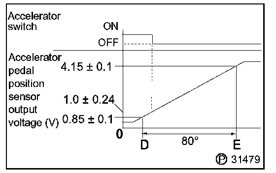 - Measure the output voltages of accelerator pedal position sensor 4 and the accelerator switch according to the table below. Adjust, if necessary.