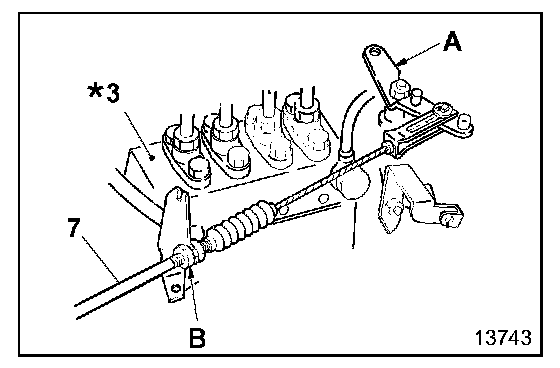 - Tighten the accelerator control cable 7 using adjustor nut B so that the accelerator pedal does not move.