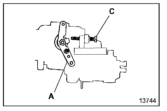 - Turn the starter switch ON, and press down on the accelerator pedal until control lever A hits stopper bolt C.