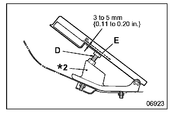 - Adjust the height of stopper bolt D of accelerator pedal assembly *2 in such a manner that the clearance between stopper bolt contact surface E and the stopper bolt conforms to the specified value.