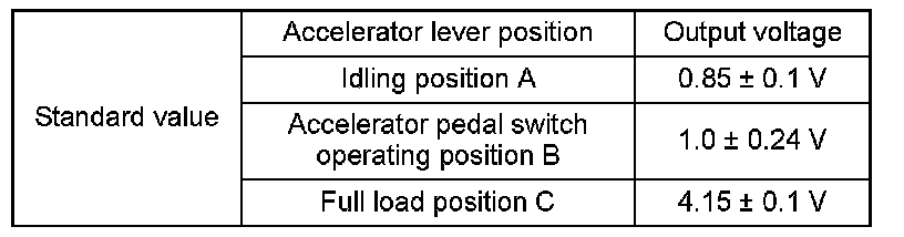 - Measure the output voltage at terminals 2 and 5 (sensor 1) and the output voltage at terminals 1 and 2 (sensor 2) with the accelerator lever in each specified position.
