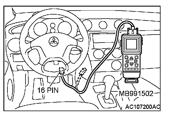 CAUTION: To prevent damage to scan tool MB991502, always turn the ignition switch to the "LOCK" (OFF) position before connecting or disconnecting scan tool MB991502.