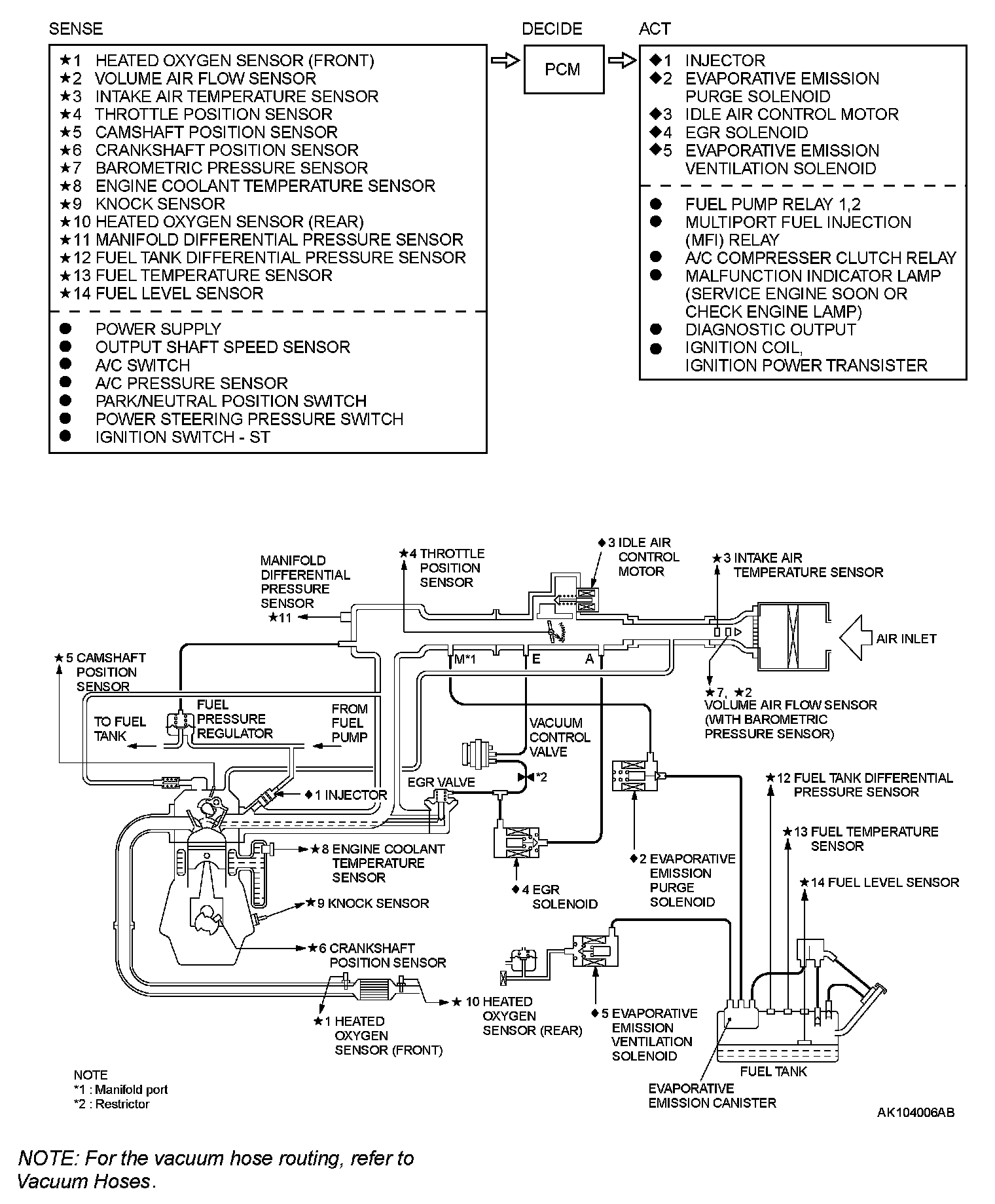 The Multiport Fuel Injection System consists of sensors, actuators and the powertrain control module (PCM). The sensors detect the engine condition. The module controls the system based on signals from these sensors. The actuators work under the control of the PCM. The PCM carries out activities such as fuel injection control, idle air control, and ignition timing control. In addition, the PCM has several diagnostic test modes which simplify troubleshooting when a problem develops.