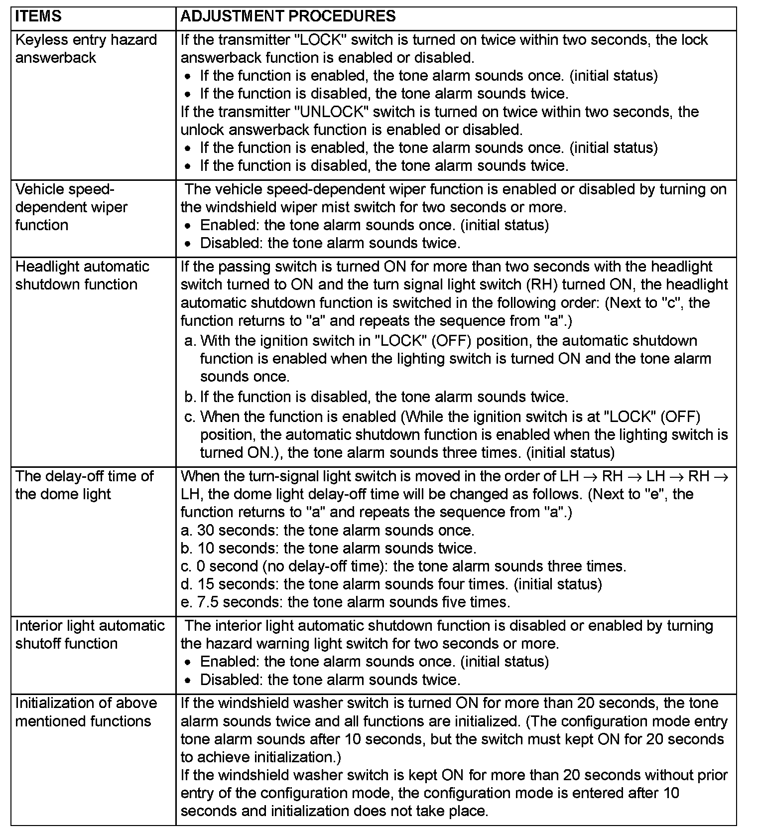 NOTE: The keyless entry hazard answer back can be also adjusted by operating the RKE transmitter, (however, this adjustment can be done more easily by operating the transmitter.) Refer to Keyless Entry System - On-vehicle Service - Enabling/disabling the Answer back Function.