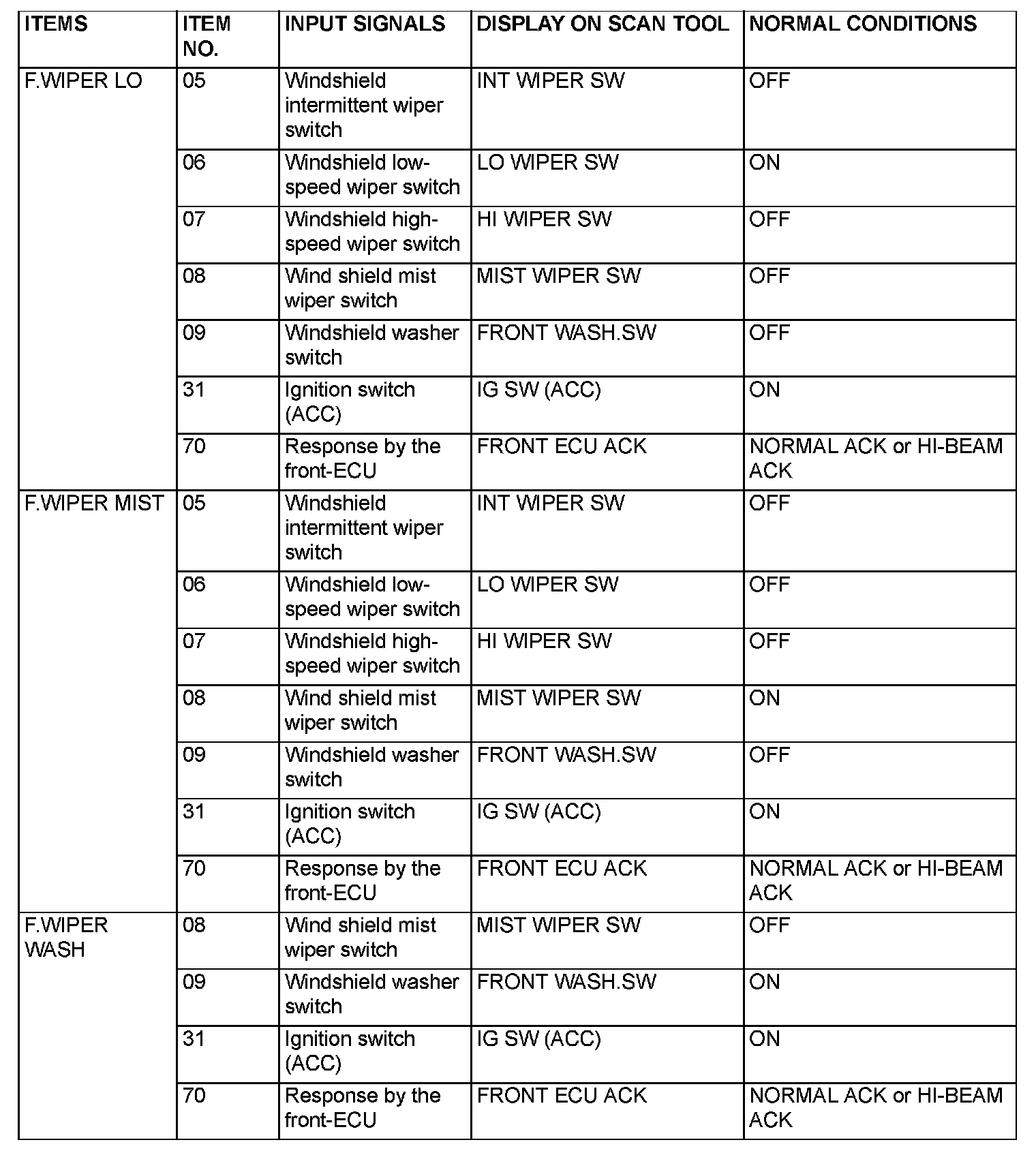 For checking item "HI (High-beam)", the scan tool displays "OFF" on the item No. 2 "Dimmer SW" when the headlights are at high-beam. Therefore, the scan tool should display "ON" momentarily when the dimmer switch is operated.