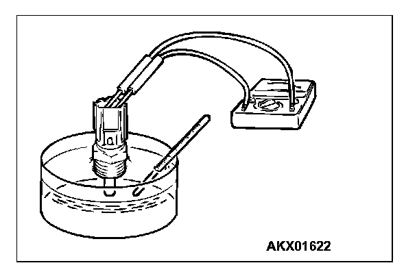 2. With the temperature sensing portion of engine coolant temperature sensor immersed in hot water, check the resistance.