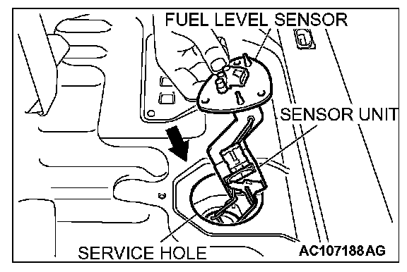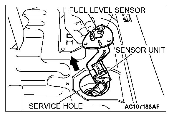 CAUTION: Pay attention not to damage the sensor unit and the float of the fuel level sensor when withdrawing it from the service hole.