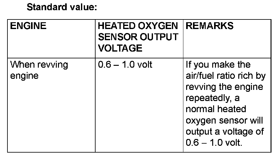 NOTE: If the sufficiently high temperature [of approximate 400 °C (752 °F) or more] is not reached although the heated oxygen sensor is normal, the output voltage would be possibly low although the rich air/fuel ratio. Therefore, if the output voltage is low, use jumper wires to connect the terminal No. 2 and the terminal No. 1 of the heated oxygen sensor with a (+) terminal and (-) terminal of 8 volts power supply respectively, then check again.