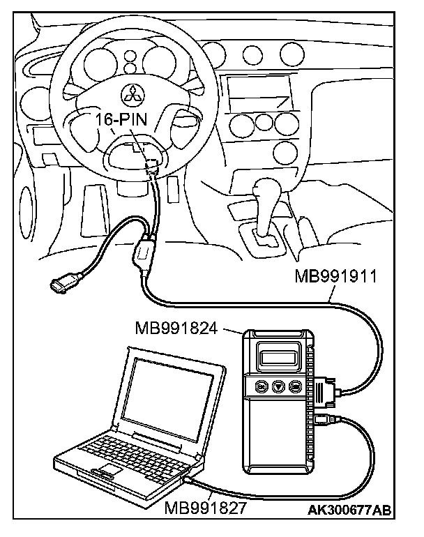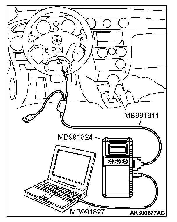 CAUTION: To prevent damage to scan tool MB991958, always turn the ignition switch to the "LOCK" (OFF) position before connecting or disconnecting scan tool MB991958.