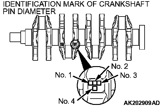 Measure the crankshaft pin diameter and confirm its classification from the following table. On a crankshaft supplied as a service part, identification marks of its pins are stamped at the positions shown in the illustration.
