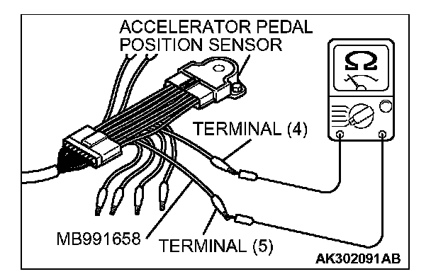 3. Connect the ohm meter between terminal No. 4 and No. 5 of the accelerator pedal position sensor.