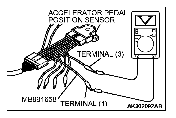 9. Connect the digital voltmeter between terminal No. 3 [accelerator pedal position sensor (main) output] and terminal No. 1 [accelerator pedal position sensor (main) earth].