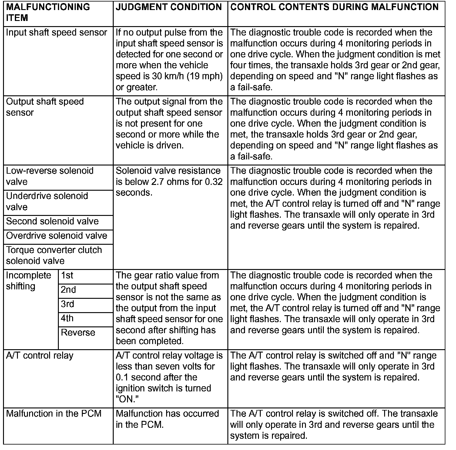 When a malfunction of a main sensor or actuator is detected by the PCM, the transaxle is controlled by pre-set control logic to maintain safe conditions for driving.