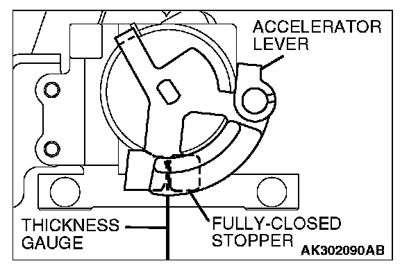 4. Insert a thickness gauge with a thickness of 0.60 mm (0.024 in.) in between the accelerator lever and the fully closed stopper.