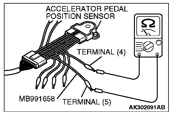 3. Connect the ohm meter between terminal No. 4 and No. 5 of the accelerator pedal position sensor.