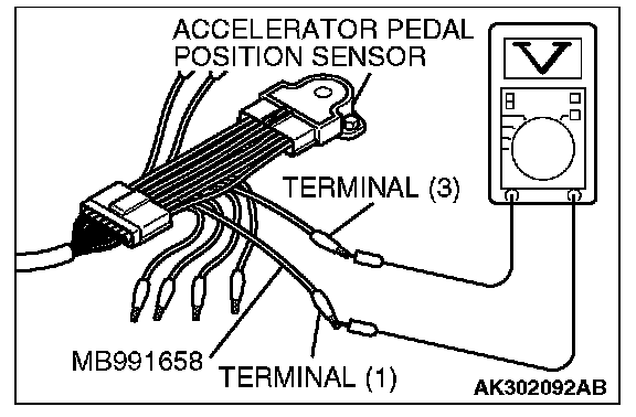 9. Connect the digital voltmeter between terminal No. 3 [accelerator pedal position sensor (main) output] and terminal No. 1 [accelerator pedal position sensor (main) earth].
