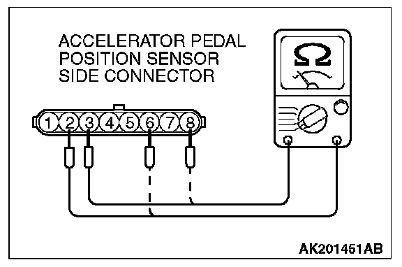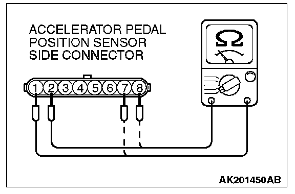 2. Measure the resistance between accelerator pedal position sensor connector terminal No. 1 [accelerator pedal position sensor (main) earth] and terminal No. 2 [accelerator pedal position sensor (main) power supply], and between terminal No. 7 [accelerator pedal position sensor (sub) earth] and terminal No. 8 [accelerator pedal position sensor (sub) power supply].