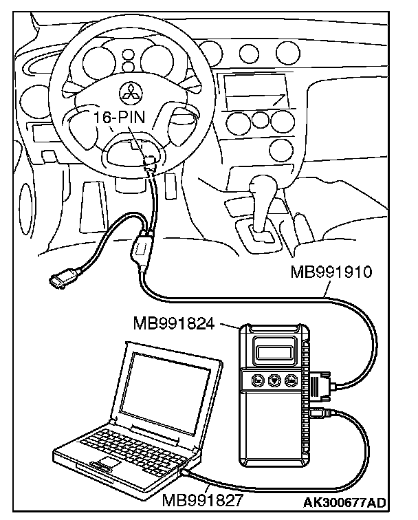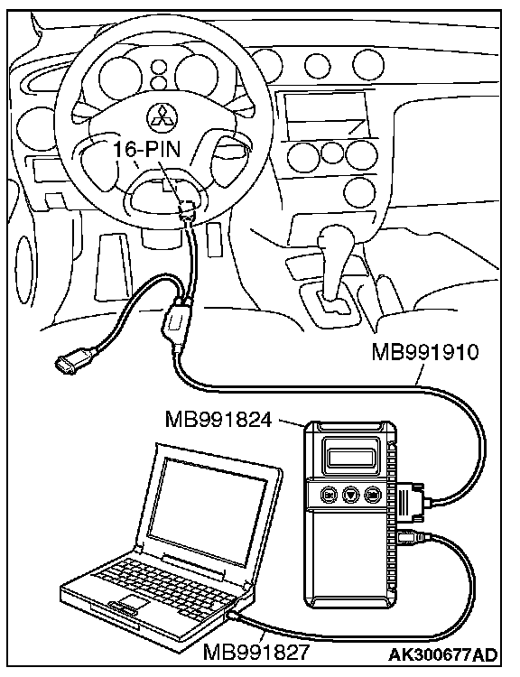 CAUTION: To prevent damage to scan tool MB991958, always turn the ignition switch to the "LOCK" (OFF) position before connecting or disconnecting scan tool MB991958.