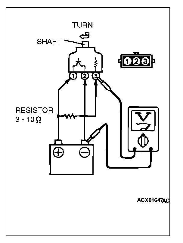 2. Turn the shaft of the vehicle speed sensor and check that there is voltage between terminals 2- 3. (1 turn = 4 pulses)