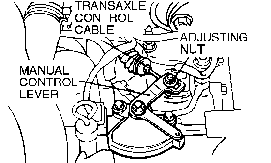 6. Gently push the transaxle control cable in the direction of the arrow, until the cable is taut. Tighten the adjusting nut.
